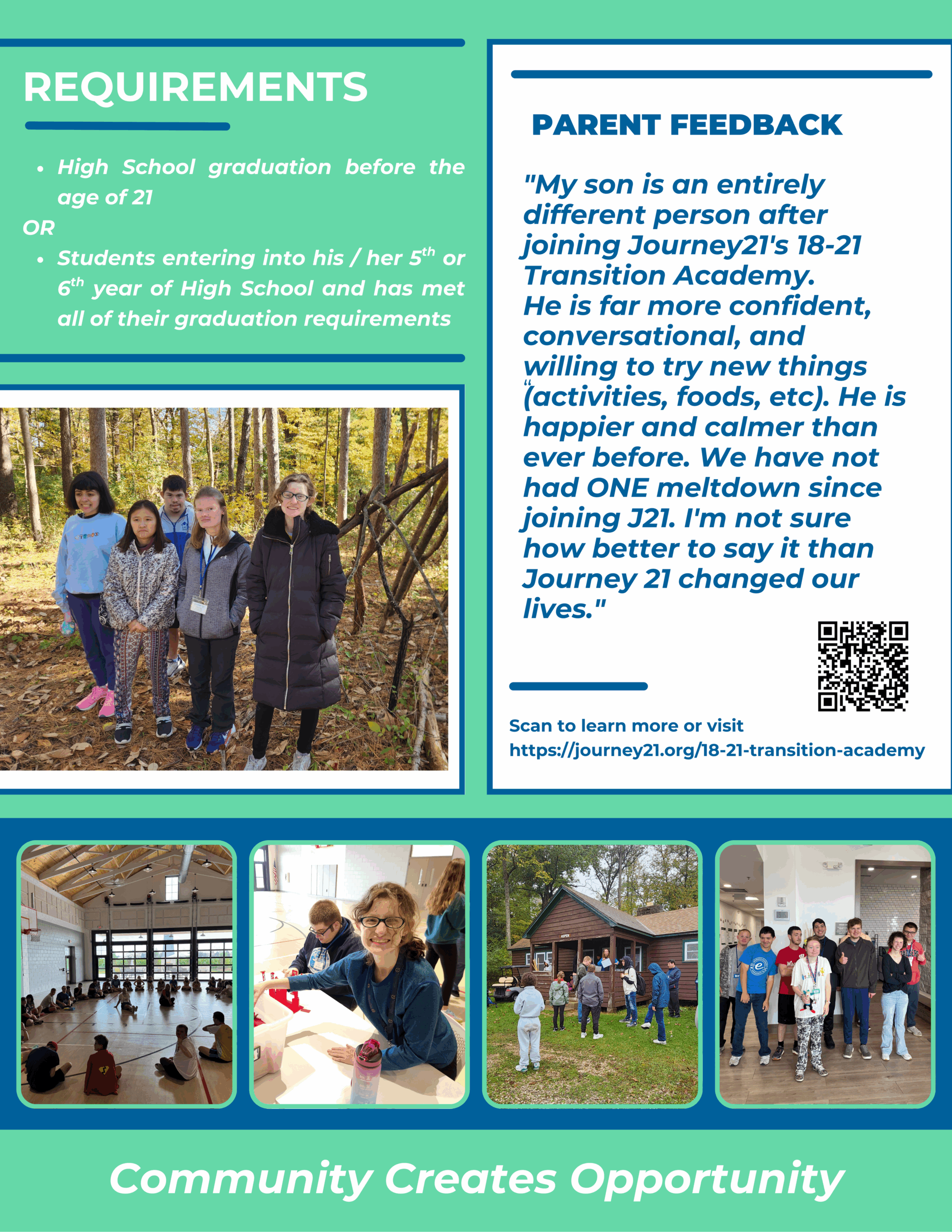 The Transition Academy follows a semester schedule and runs Monday through Friday from 8:30 am to 2:30 pm. To enroll, students must either: