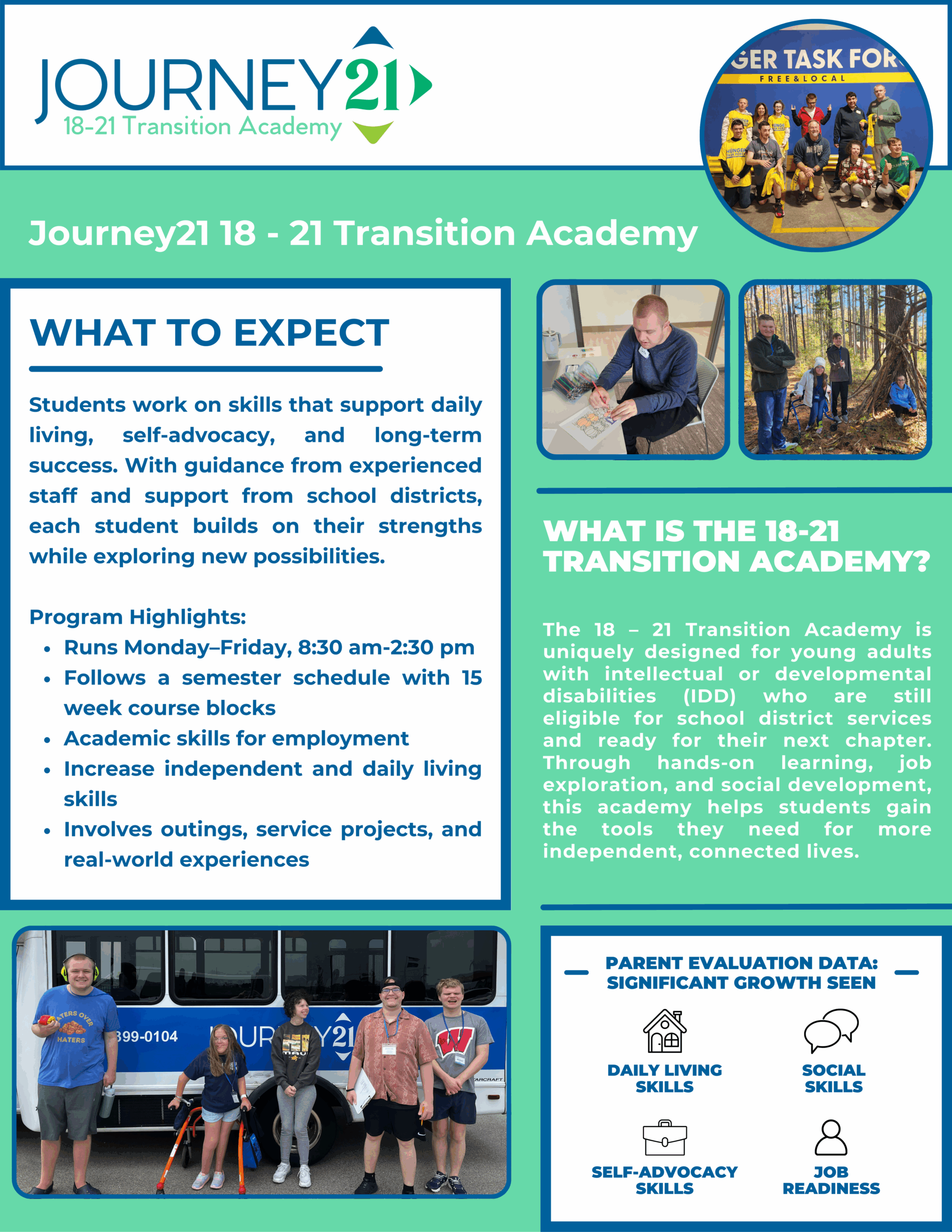 The 18–21 Transition Academy is designed for young adults with intellectual or developmental disabilities (IDD) who are still eligible for school district services and ready for their next chapter. Through hands-on learning, job exploration, and social development, this program helps participants gain the tools they need for more independent, connected lives.