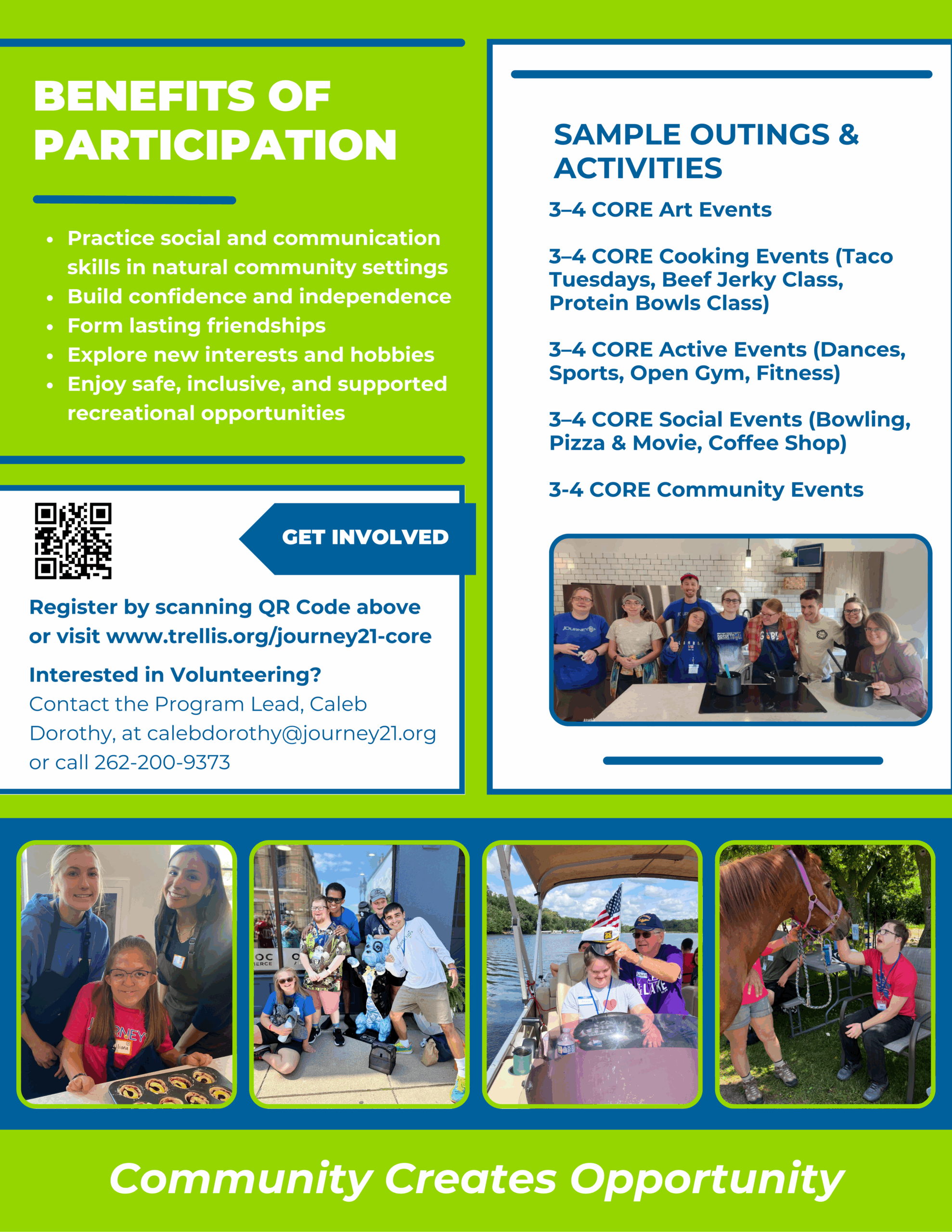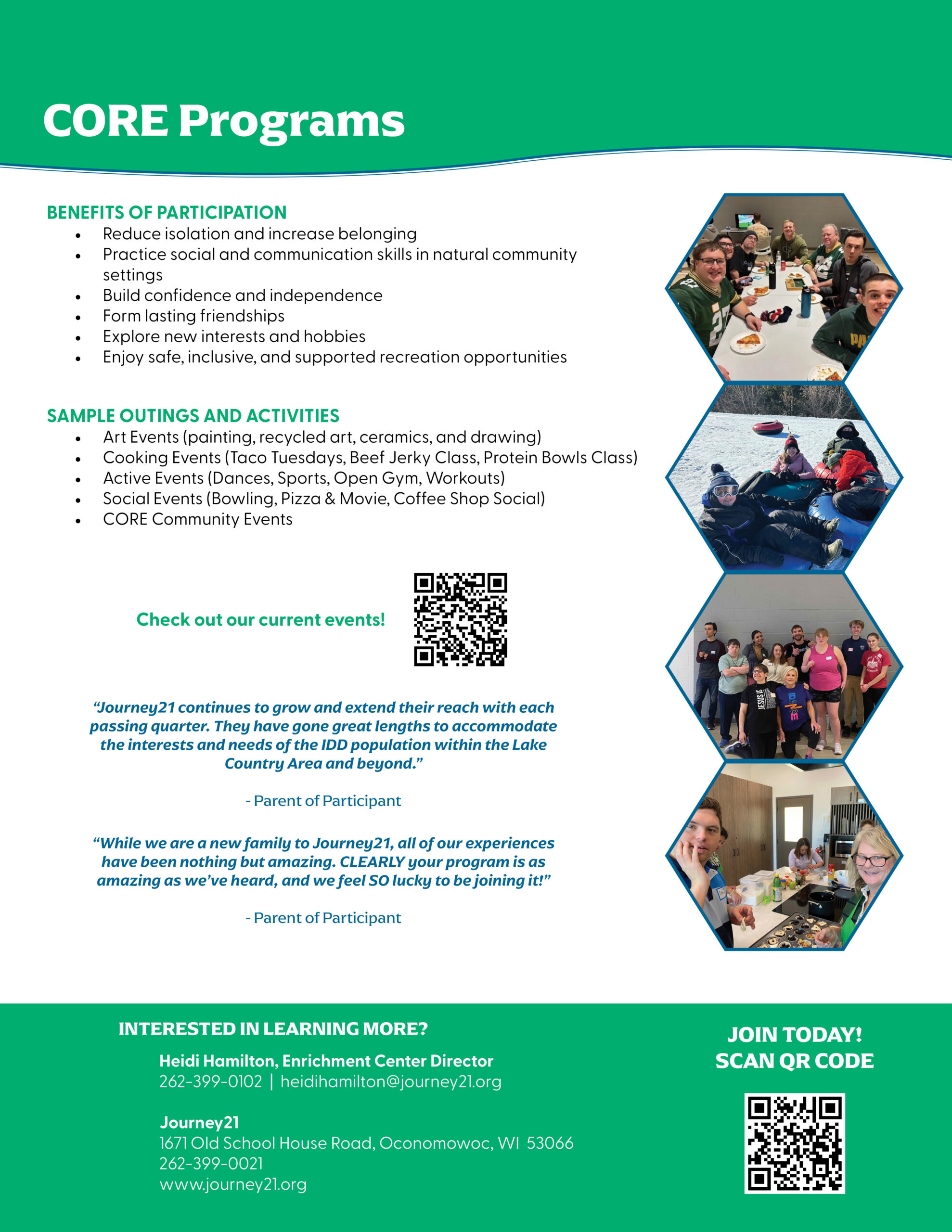 CORE is open to current Journey21 participants. A short set of enrollment forms is required to participate, and registration is needed for each event or session.
