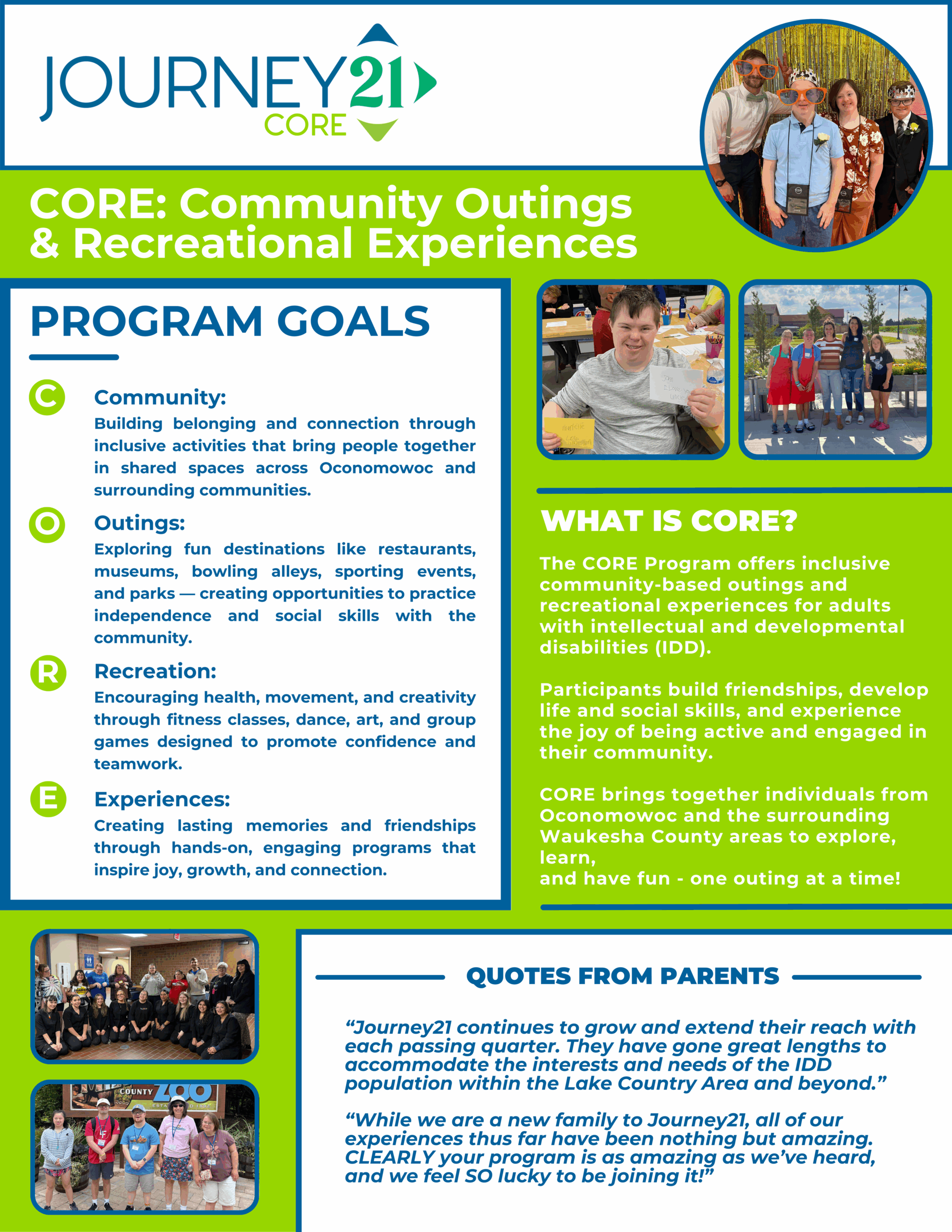Journey21’s CORE give participants the chance to enjoy meaningful time with others in a welcoming, low-pressure setting. These activities are designed to support adults with intellectual or developmental disabilities in building friendships, practicing social skills, and staying engaged with the world around them.