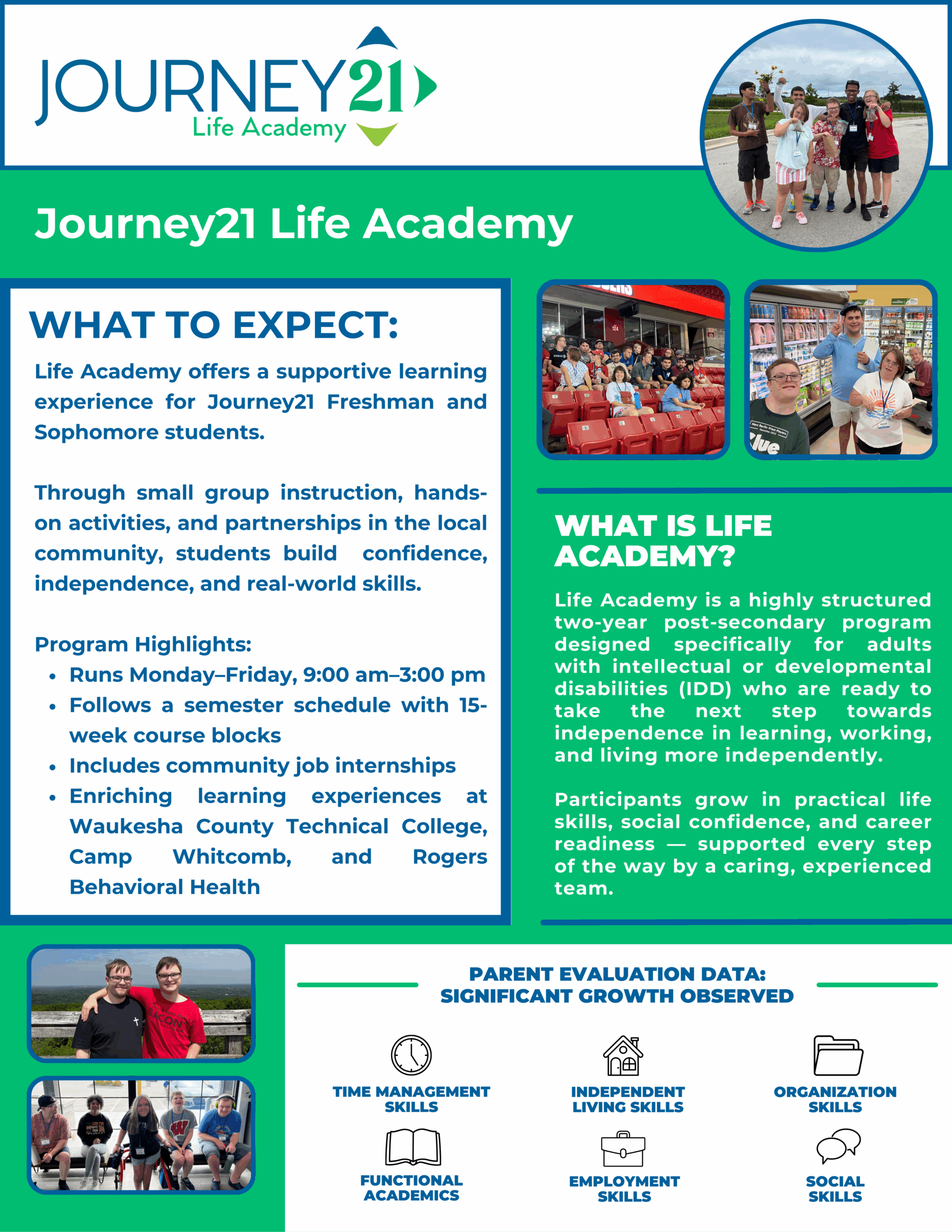 Life Academy combines small-group learning, hands-on experiences, and local partnerships to help students grow in independence and confidence. The program runs Monday through Friday, 9:00 am to 3:00 pm, on a semester schedule. Each semester includes 12-week course blocks, community internships, and enrichment activities at Camp Whitcomb and Waukesha County Technical College.
