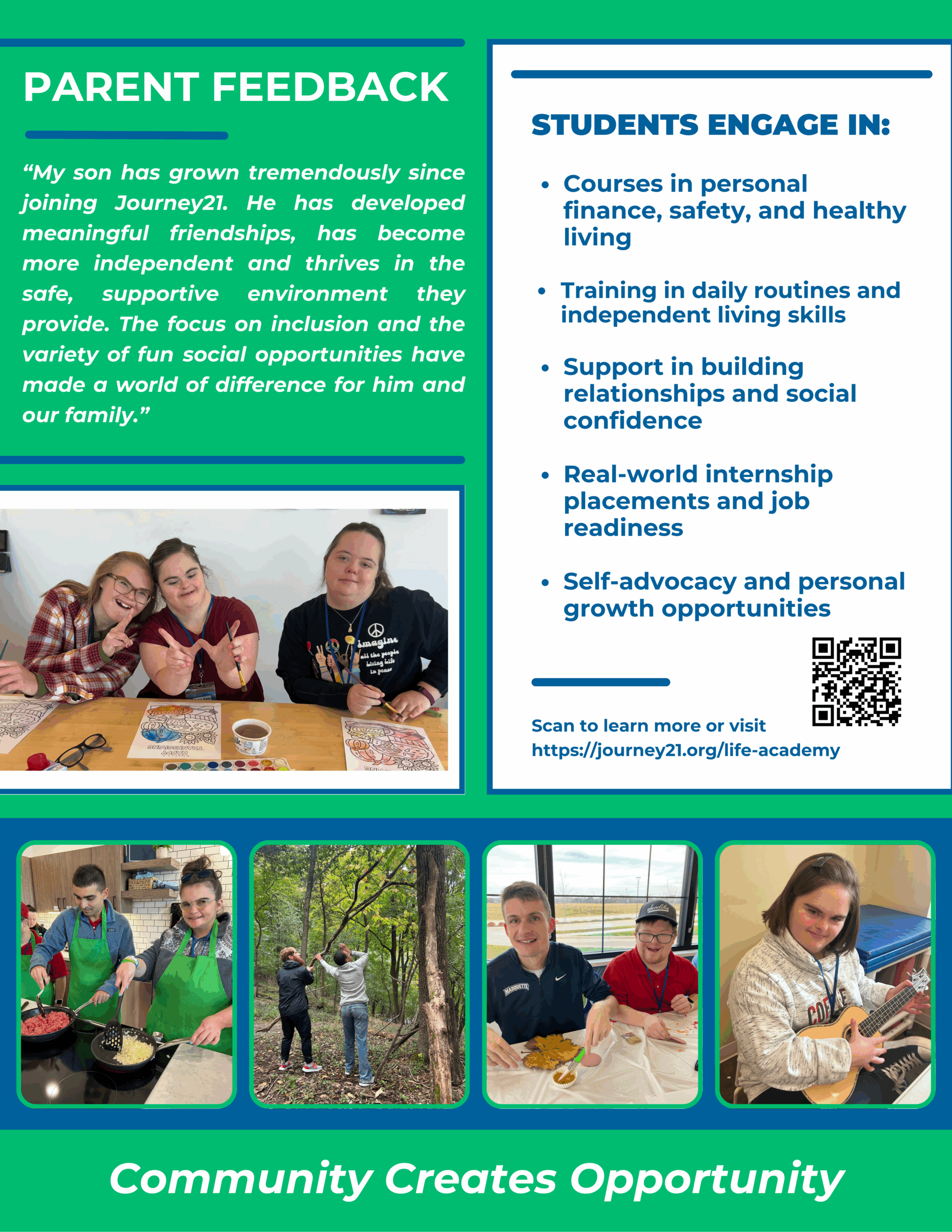 Life Academy is a structured, two-year program designed for adults with intellectual or developmental disabilities who are ready to take the next step in learning, working, and living more independently. Participants grow in practical life skills, social confidence, and career readiness—supported every step of the way by a caring, experienced team.