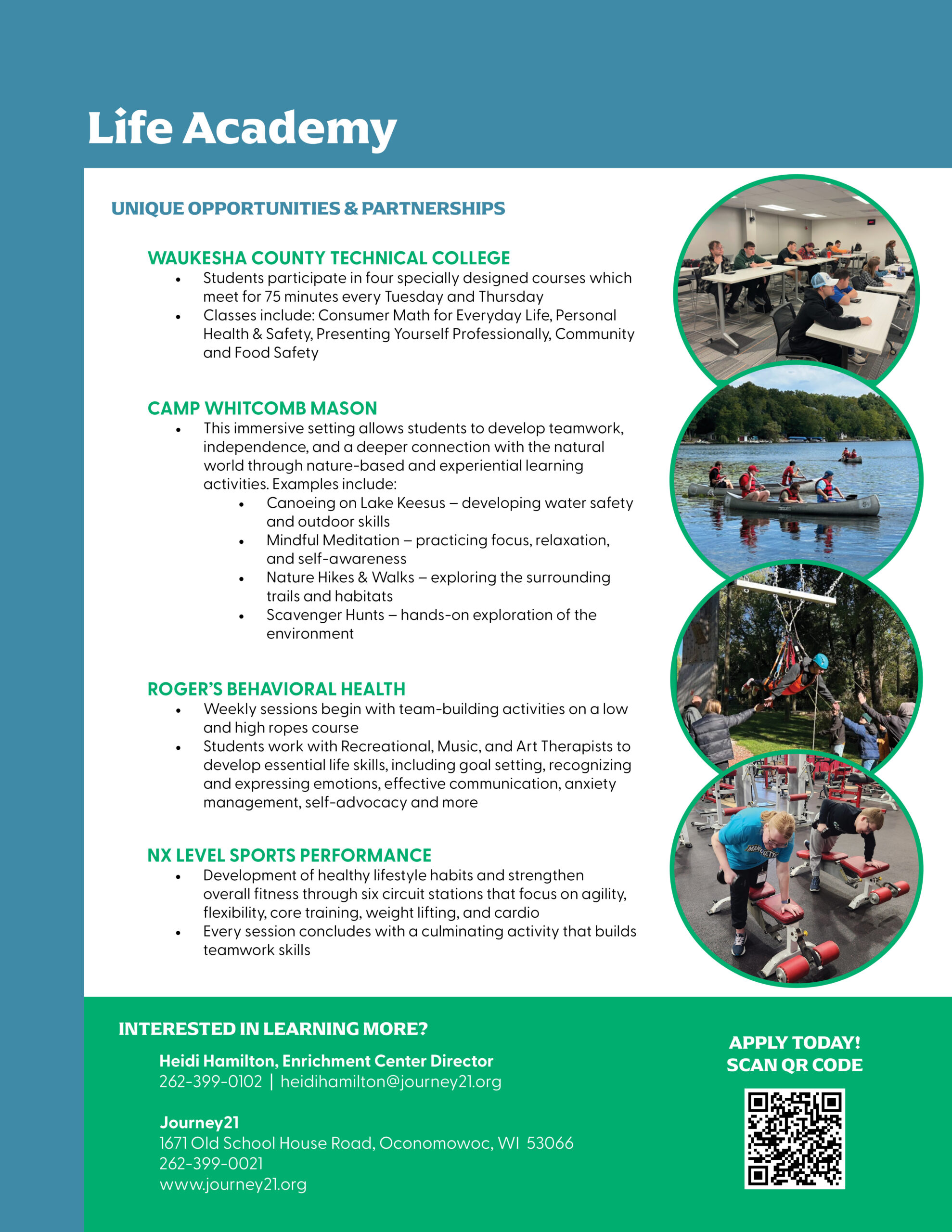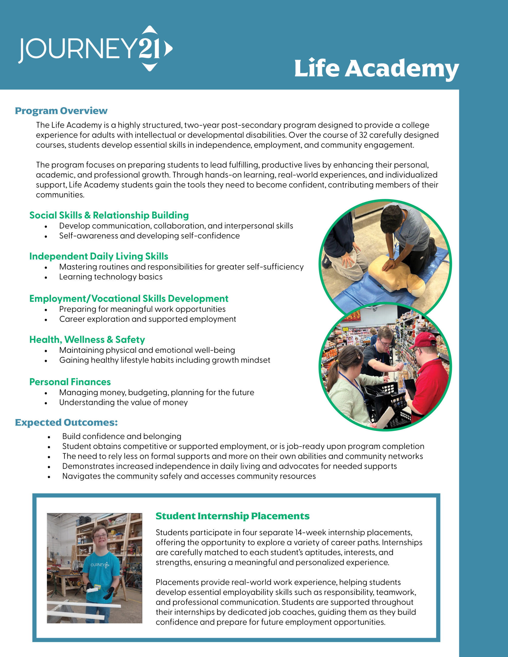 The program focuses on preparing students to lead fulfilling, productive lives by enhancing their personal, academic, and professional growth. Through hands-on learning, real-world experiences, and individualized support, Life Academy students gain the tools they need to become confident, contributing members of their communities.