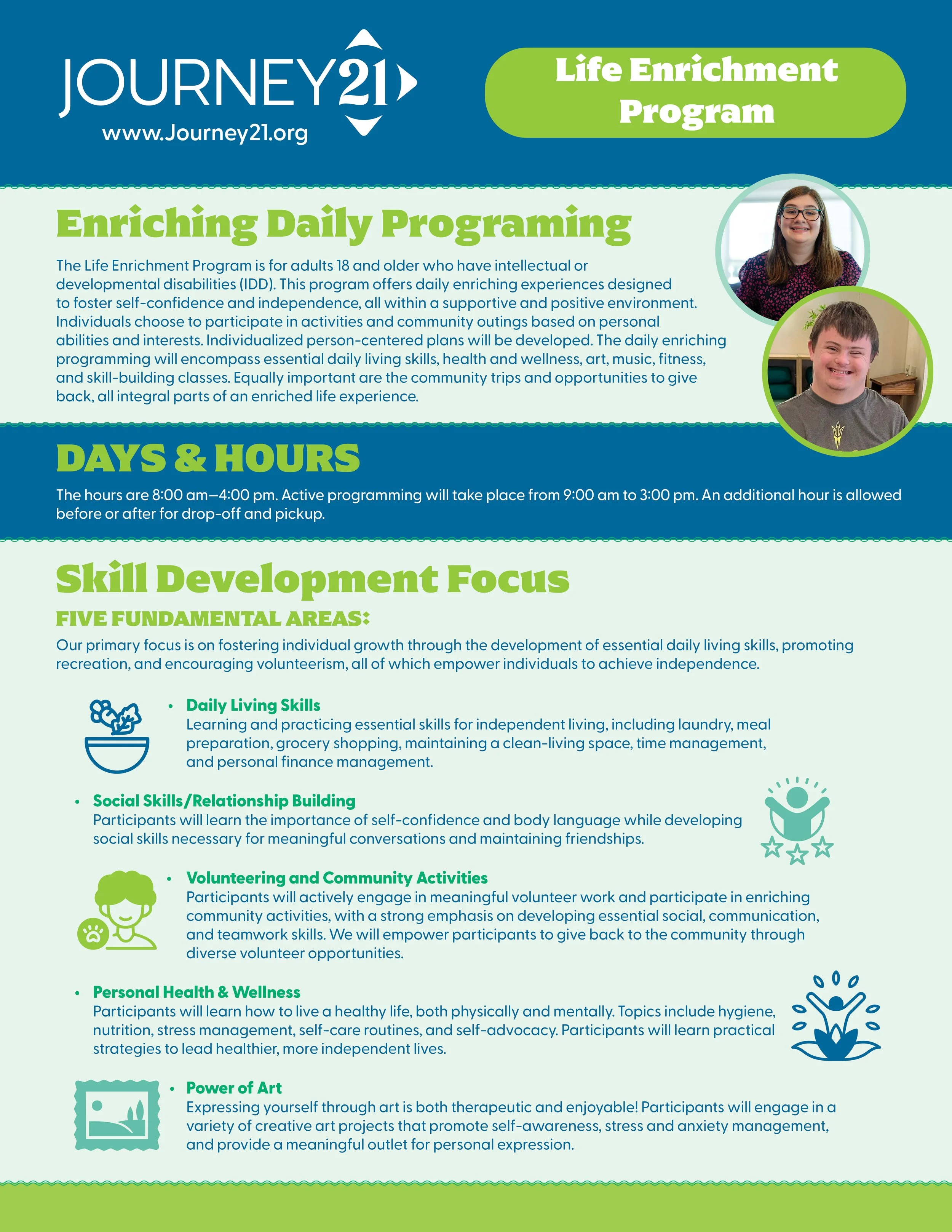 Welcome to our Life Enrichment Program, formally Journey to Independence, where we offer daily enriching experiences designed to foster self-confidence and independence, all within a supportive and positive environment.